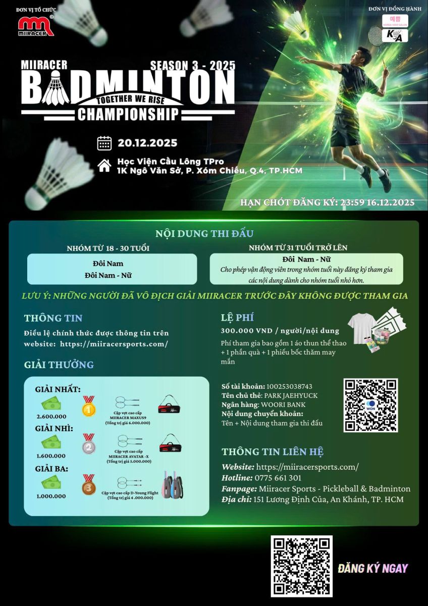 Với giải thưởng hấp dẫn, nhiều hoạt động giao lưu và quà tặng giá trị, Miiracer Championship 2025 chắc chắn sẽ là sự kiện thể thao đáng mong chờ nhất trong năm, góp phần lan tỏa tinh thần thể thao và niềm đam mê cầu lông tại Việt Nam