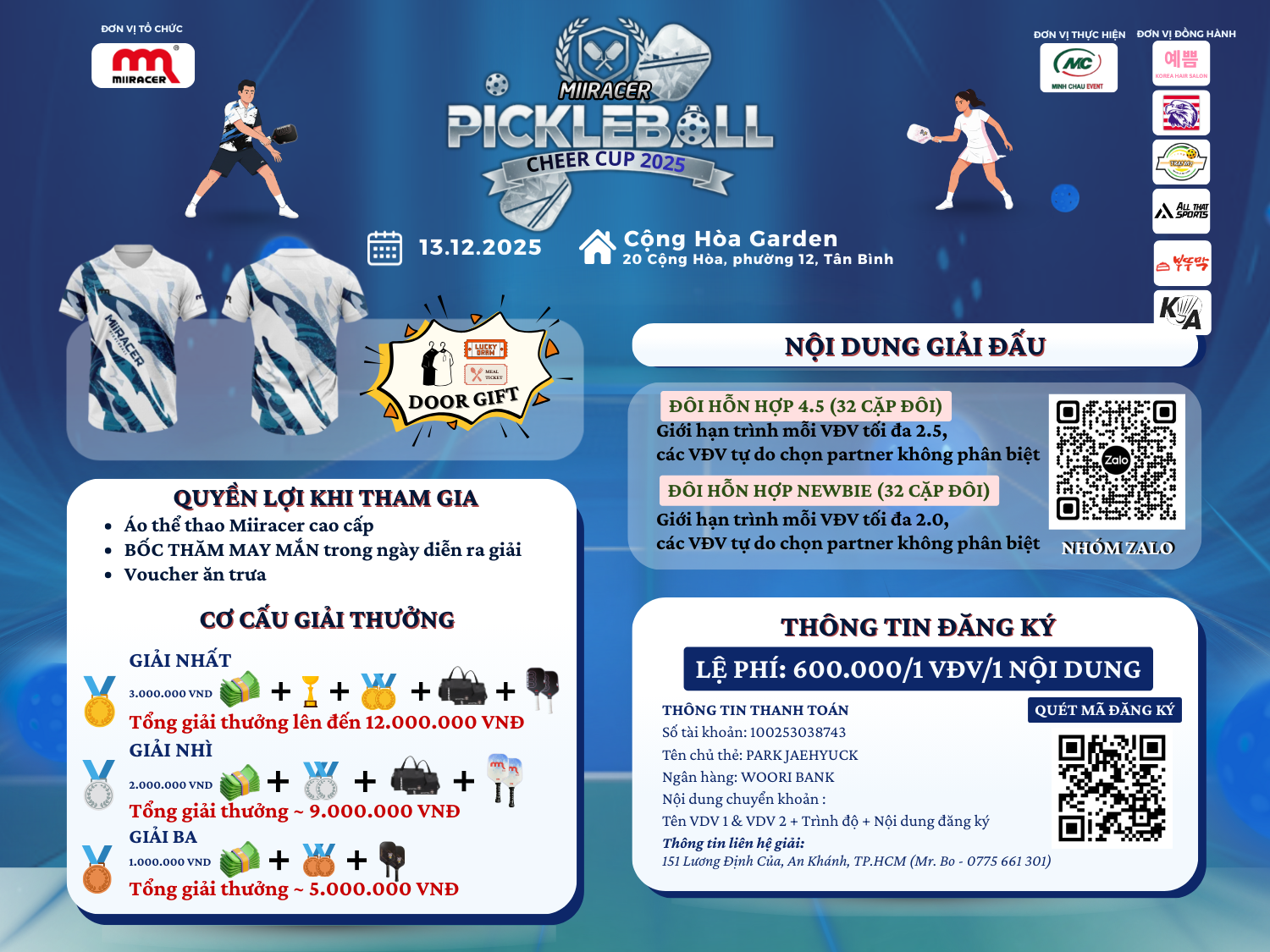 Giải Miiracer Pickleball Cheer Cup 2025 (Giải Pickleball Giao lưu cùng Miiracer) do thương hiệu thể thao Miiracer Việt Nam (thuộc công ty MF International) tổ chức, nhằm kiến tạo sân chơi lành mạnh, khuyến khích phong trào tập luyện thể dục thể thao và tăng cường sức khỏe trong cộng đồng.